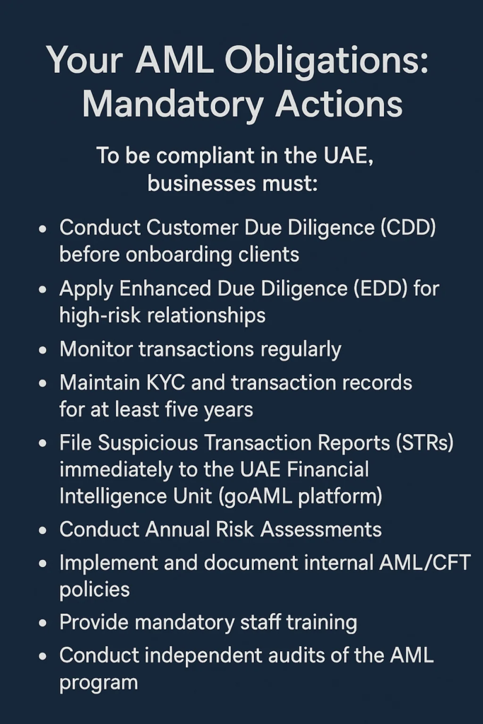 The United Arab Emirates (UAE) is a global business magnet. To ensure the country’s continued credibility, UAE authorities have strengthened their Anti-Money Laundering (AML) frameworks aligned with FATF standards. AML compliance is now mandatory across many sectors — not just banks, but also real estate, gold dealers, legal professionals, and even crypto exchanges.